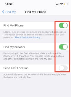 Toggle OFF ‘Find my iPhone’, ‘Find My Network’ and ‘Send Last Location