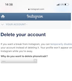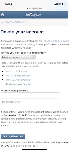 - And done! You’ll notice in the fine print at the bottom that it will give you a month to change your mind before your account is permanently deleted. After that, you’re officially off of Instagram for good.