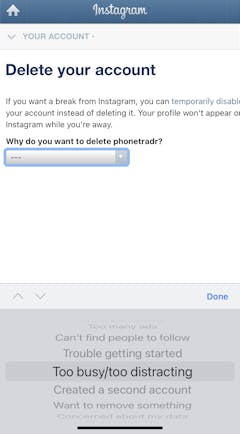 Instagram hasn’t exactly made it easy to delete your account. Firstly, you can’t permanently delete your Instagram account from the app on your phone. You’ll need to visit the exact “Delete Your Account” page created by Instagram on a web browser. Here’s the page:https://www.instagram.com/accounts/remove/request/permanent/