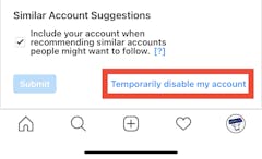 - Scroll down to the very bottom and click “Temporarily disable my account”