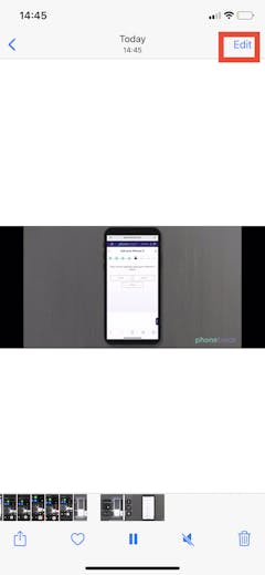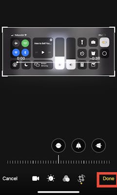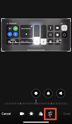 - Once it’s saved, you’ll want to remove the start and end parts that show your Control Centre. Open your camera roll, tap “Edit” at the top right. Then, tap the crop icon at the bottom right.