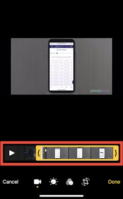 - Using your finger, slide the yellow line at the start and the end of the video to crop out the first few and last seconds. This will remove the part where you started and ended the screen record.