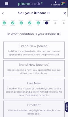 Choose the condition of your device, for example, “Excellent” or “Damaged”. We have created various condition options based on how your iPhone looks and operates. It’s important to be as honest as you can so that we don’t shortchange the buyer.